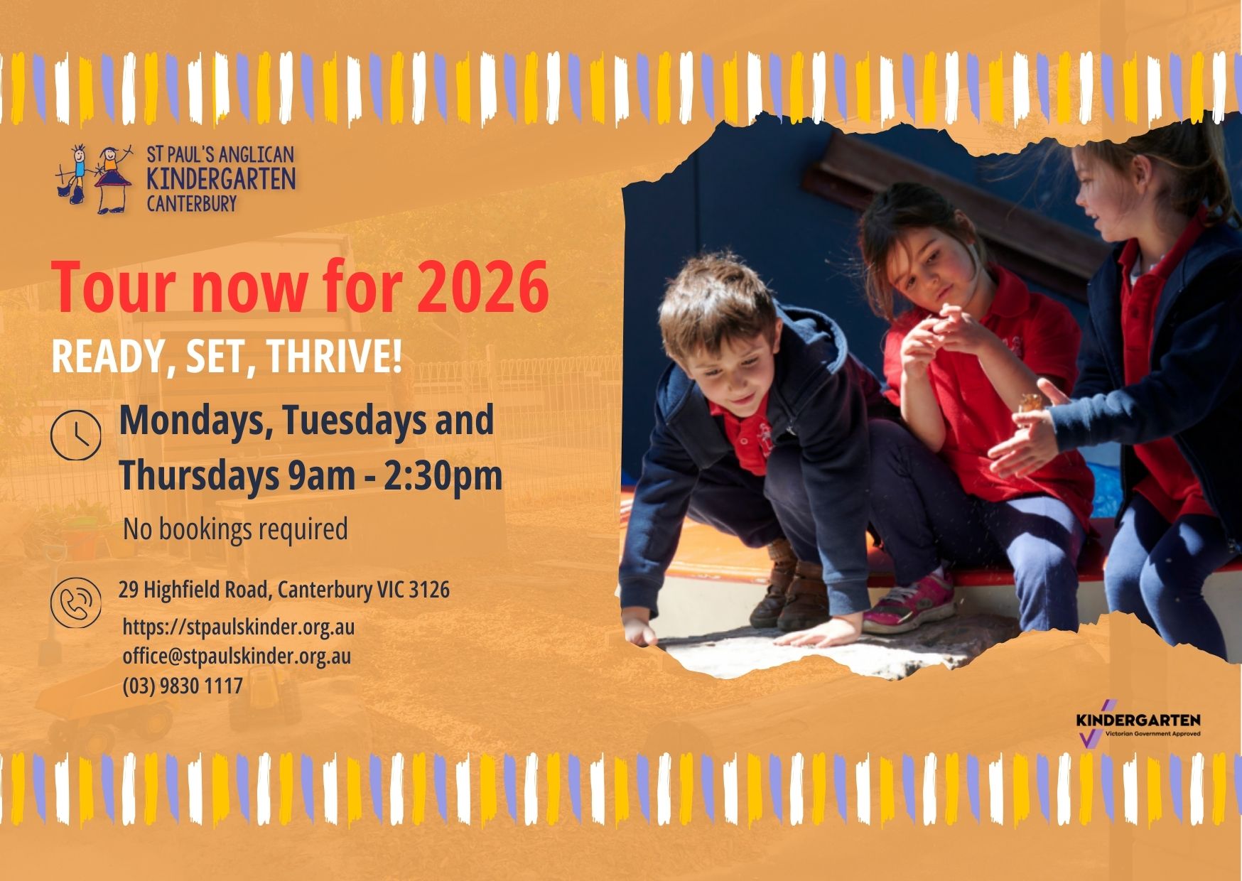 Tours available. No booking required, just come along to see our wonderful Kindergarten in action and ask your questions ahead of 2026 enrolment.